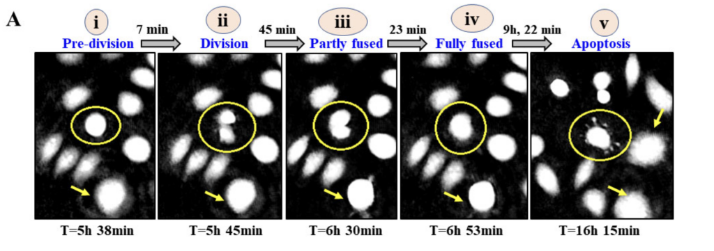 With HoloMonitor M4, authors can see the small cells are released from giant mother cells. The giant cells are multinucleated, and some of the subnuclei may possess a proper set of chromosomes, which allows them to survive.