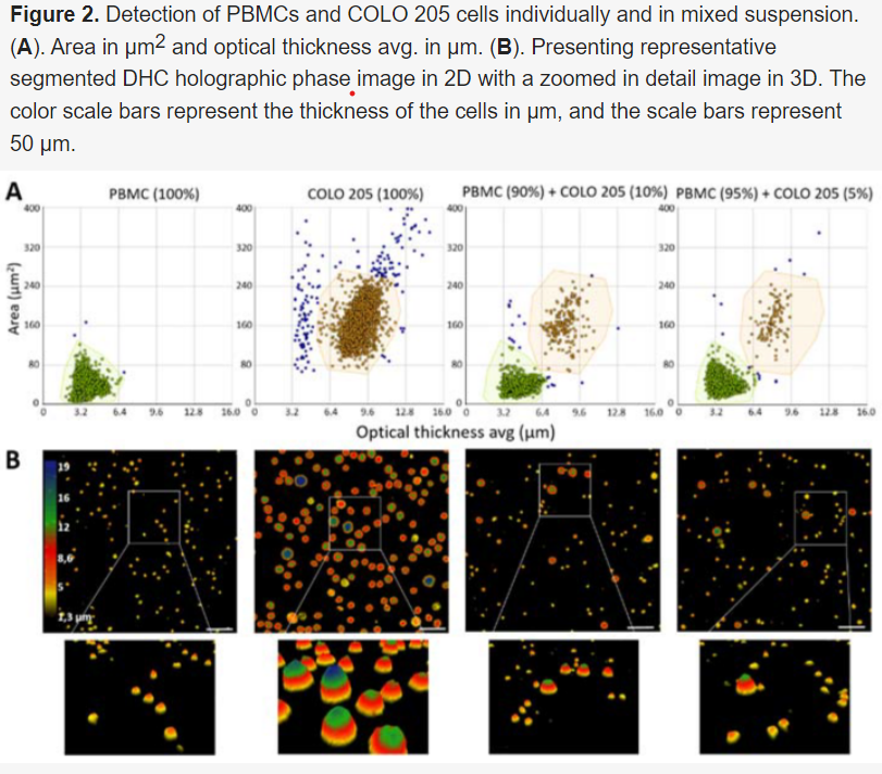 By establishing differences in the cell area, cell thickness, cell volume, and cell irregularity even when the CRC cells were in the minority (5% out of PBMCs), HoloMonitor M4 can discriminate between CRC cells and the PBMCs in vitro. This suggests HoloMonitor is a new powerful tool for discriminating cells of different sizes in suspension and combining biomarkers.